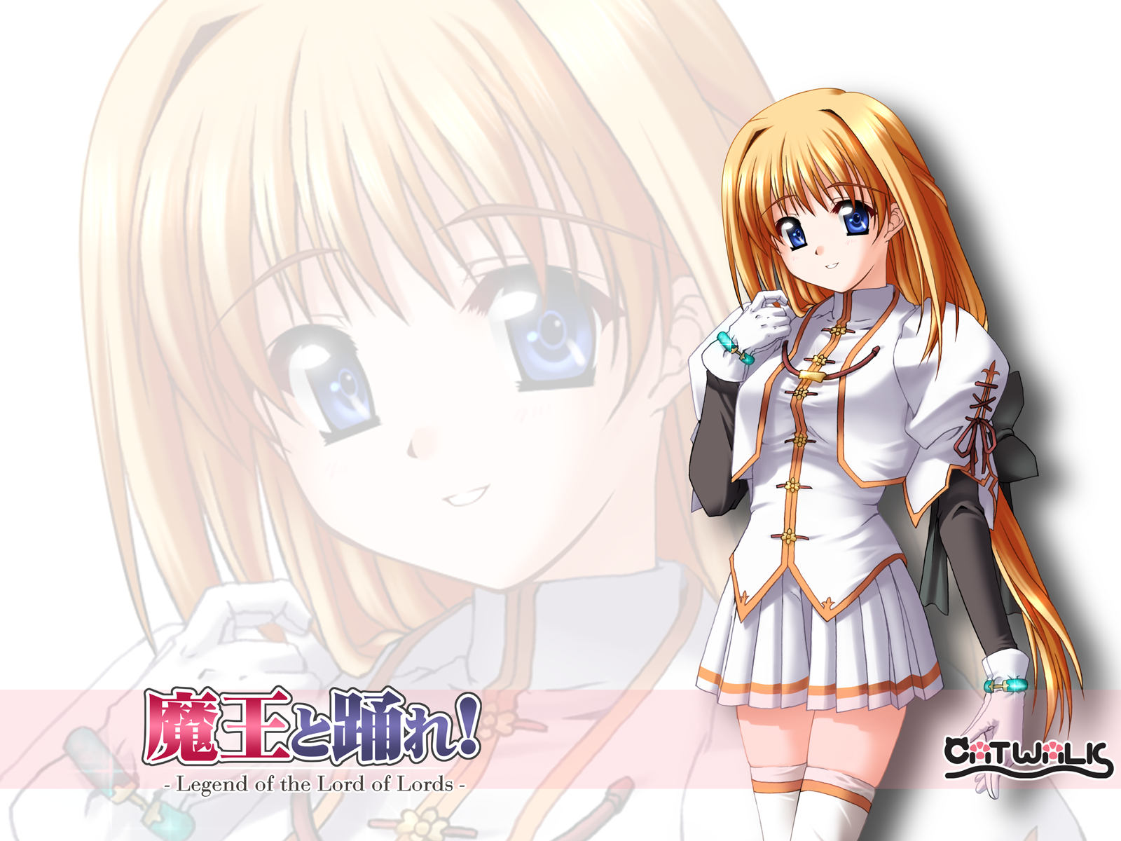 Description: A anime girl with long hair and blue eyes wearing a white dress and holding a cell phone in her hand.