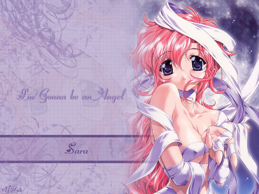 Description: A anime girl with pink hair and a white dress is holding a white ribbon and a purple background with a full moon.