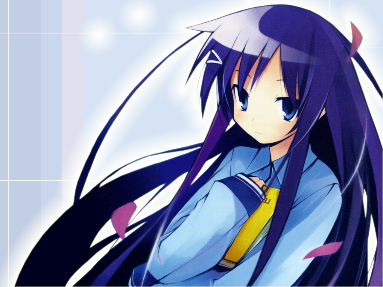 Description: A anime girl with long purple hair and a blue shirt and yellow tie is standing in front of a white background.