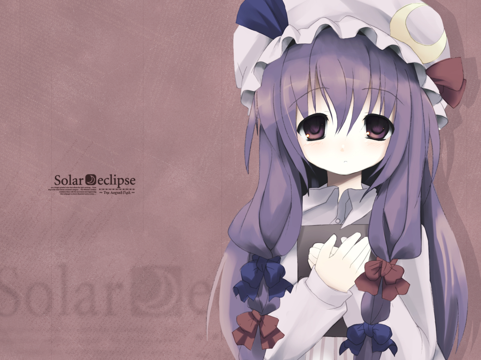 Description: A anime girl with long purple hair and a white dress with a bow around her neck and a white shirt with a blue collar.