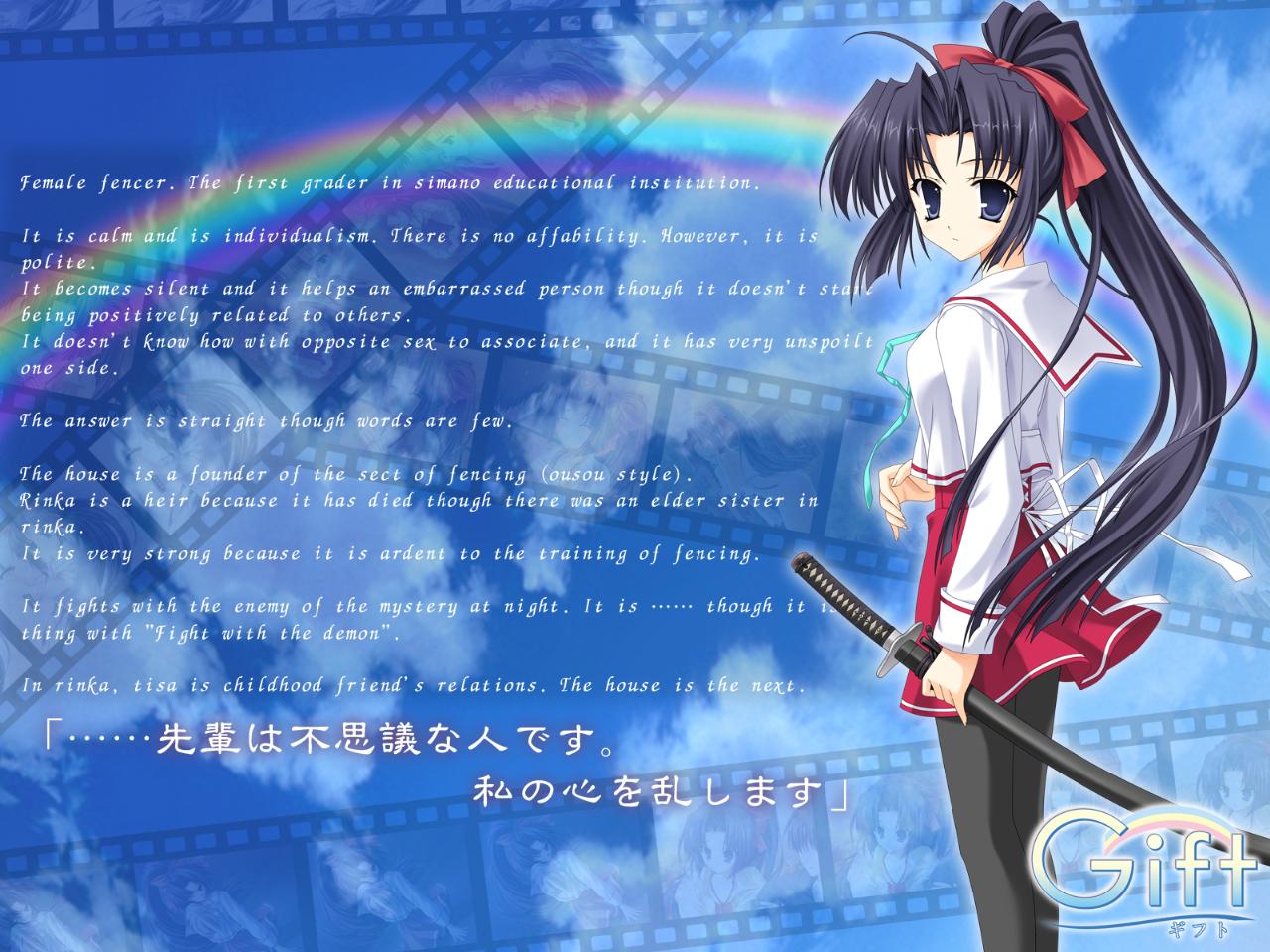 Description: A anime girl with long hair and a red bow holding a sword in front of a rainbow background with a rainbow.