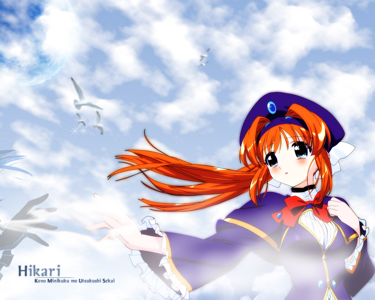 Description: A anime girl with long red hair and a hat on her head is flying through the air with birds in the background.