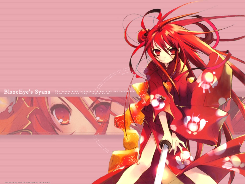 Description: A anime girl with red hair and a red dress holding a sword and a pink background with a red and white banner.