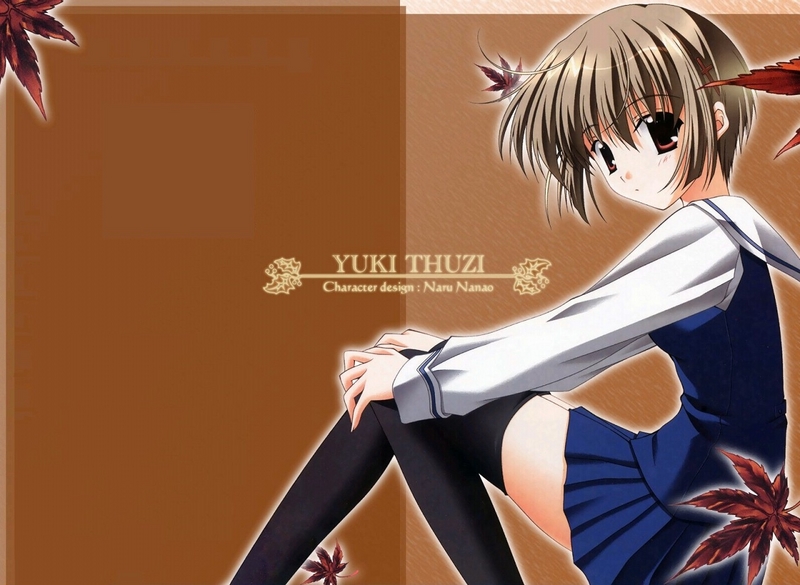 Description: A anime girl sitting on a floor with a bird flying above her head and a maple tree in the background.
