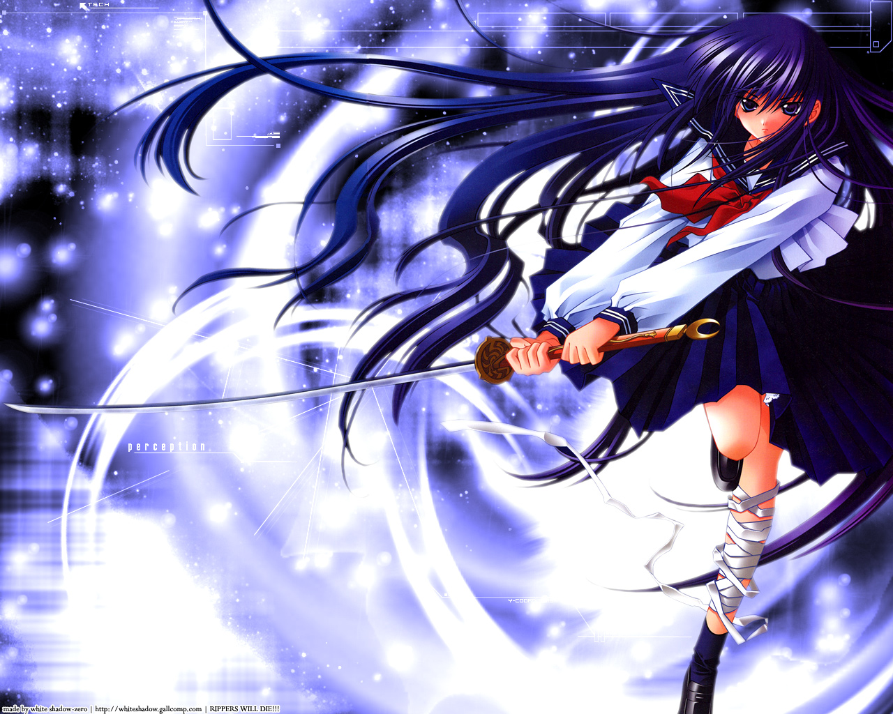 Description: A anime girl with long hair holding a sword in her hand and a purple background with stars and snow flakes.