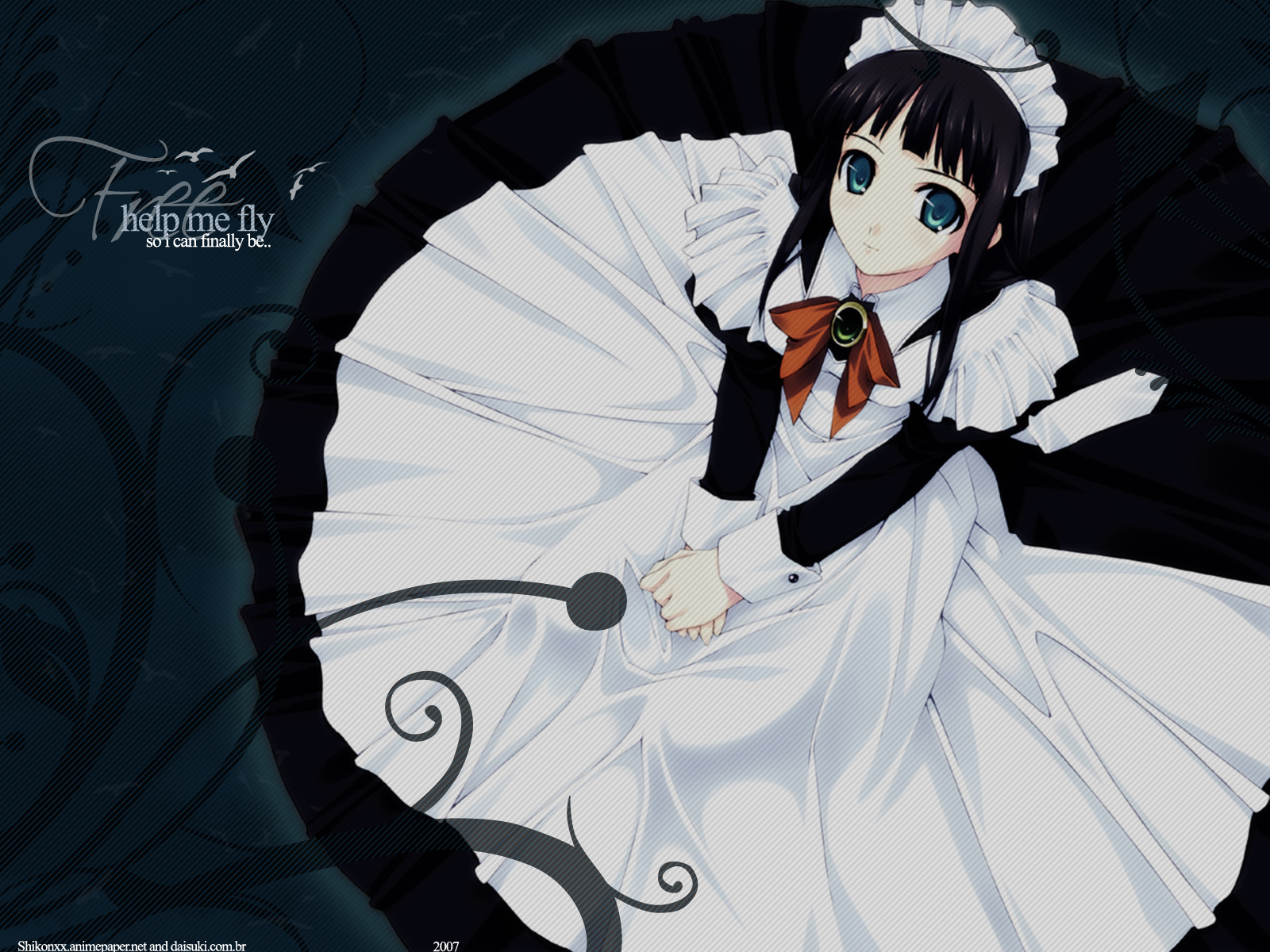 Description: A anime girl in a white dress with a black and red bow on her head and a black and white dress on her body.