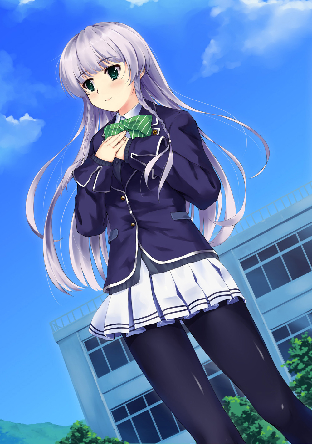 Description: A anime girl with long white hair and a blue jacket and black pants standing in front of a building.