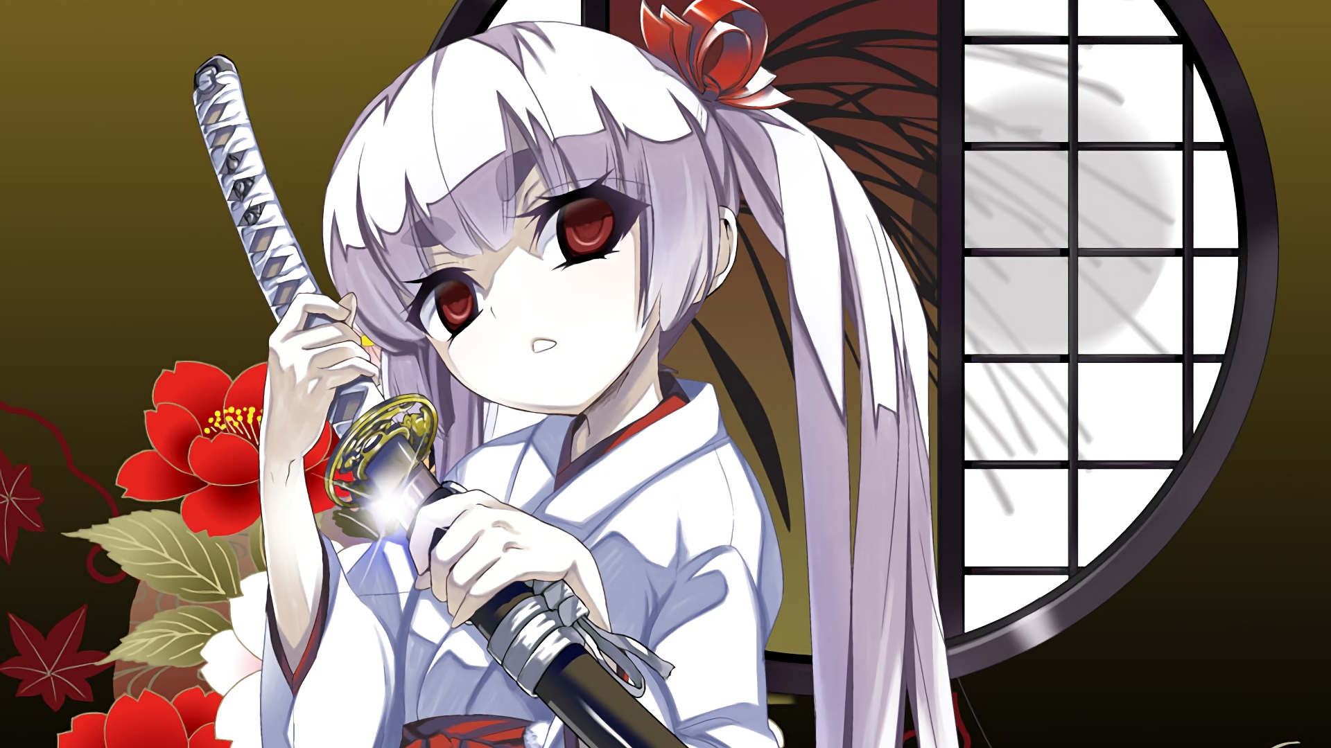 Description: A anime girl with long white hair holding a microphone and a flowered background with a window behind her.