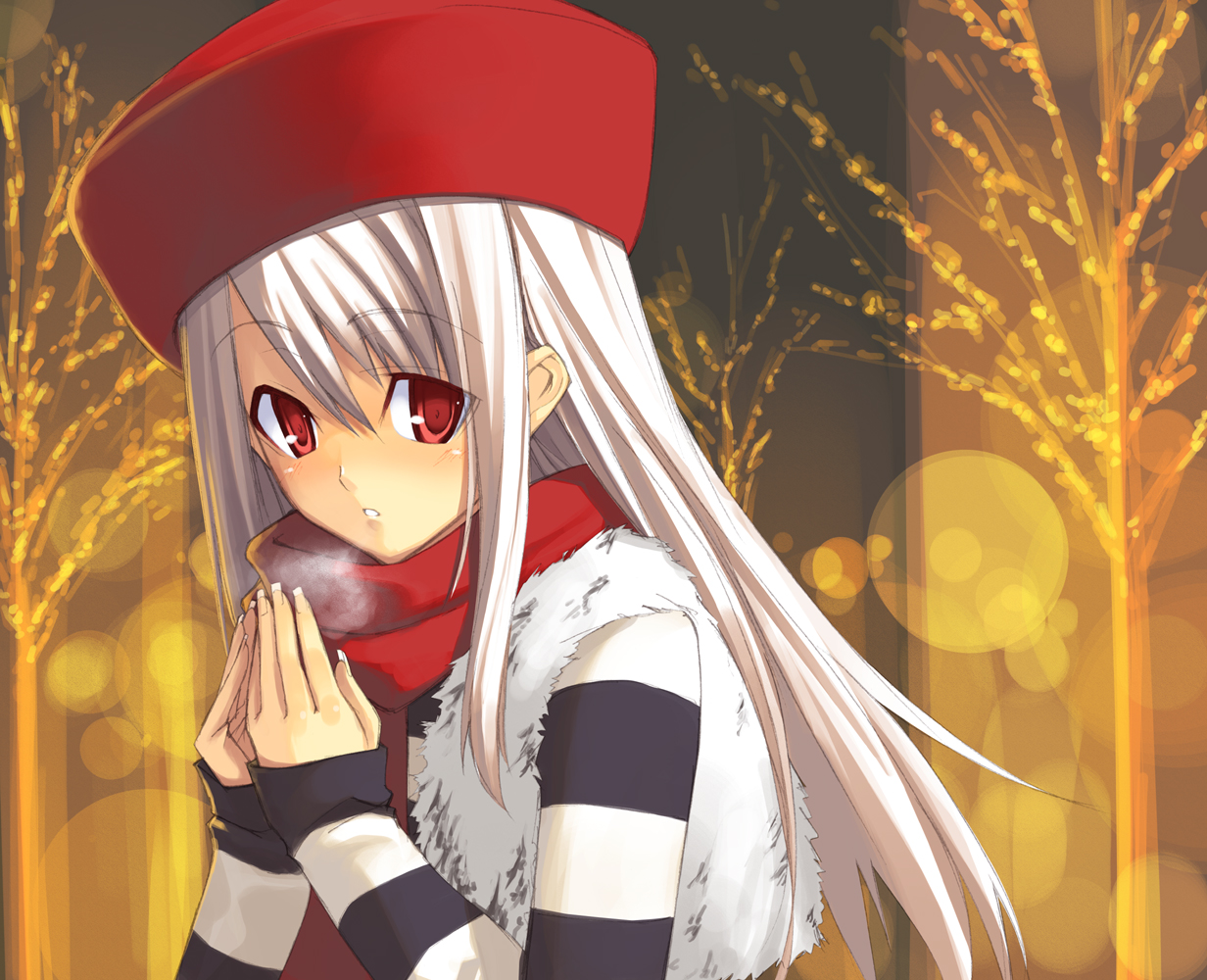 Description: A anime girl with long white hair and a red hat on her head is standing in front of a forest.