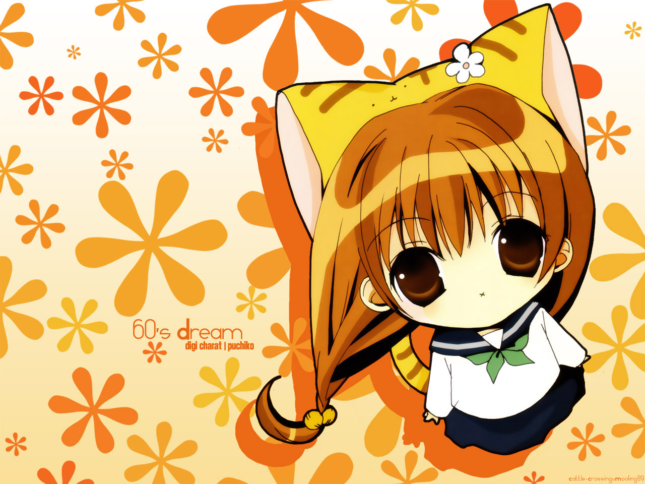 Description: A anime girl with a yellow hat and long hair is standing in front of a flowery background with orange flowers.