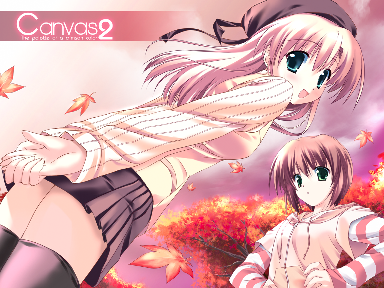 Description: Two anime girls in a field of leaves and trees with leaves falling from the sky behind them.