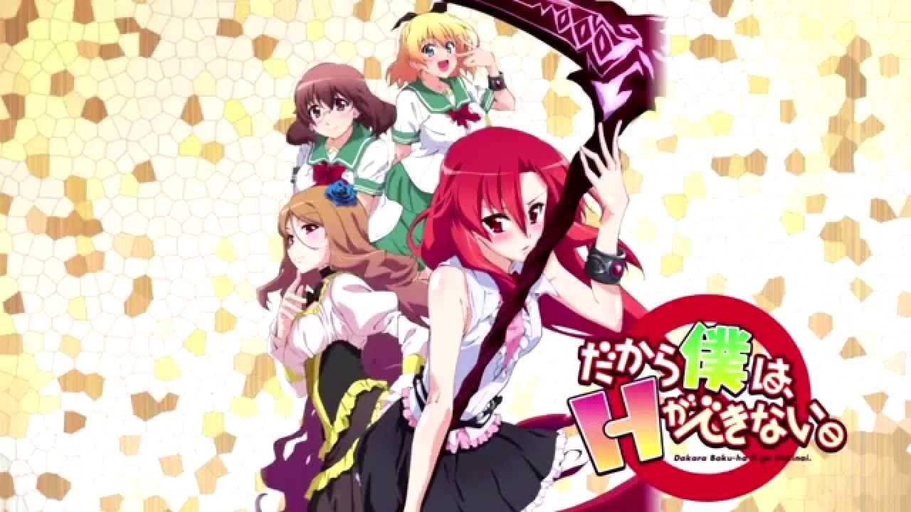 Description: A group of anime girls with a banner in front of them that says.