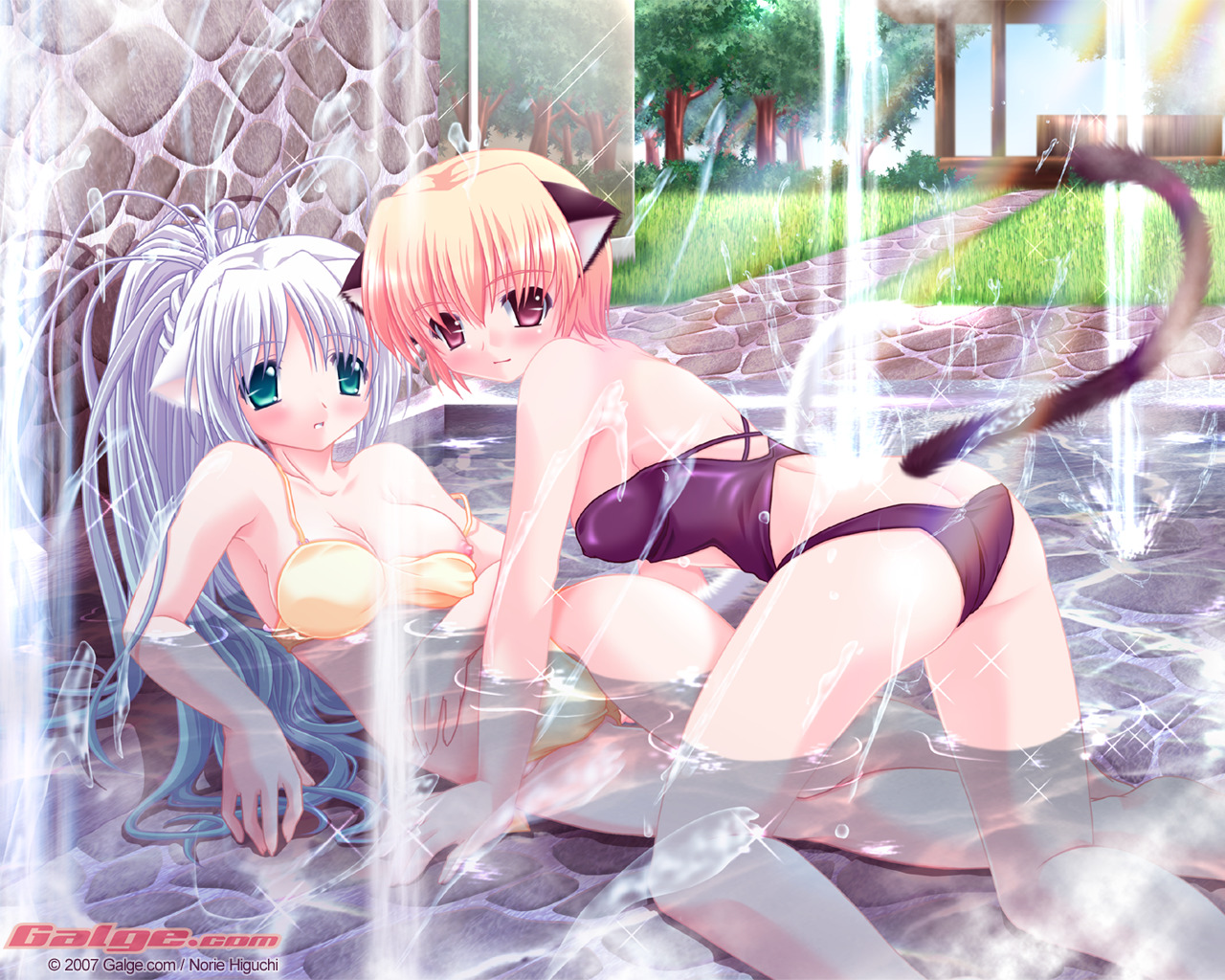 Description: Two anime girls in bathing suits sitting in a pool of water with a cat on their back and a cat on their shoulder.