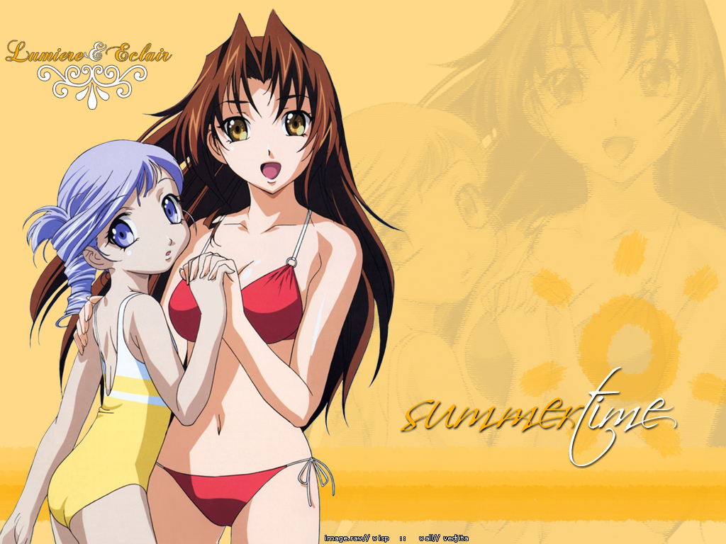 Description: Two anime girls in bathing suits standing next to each other with a yellow background behind them and a yellow background behind them.