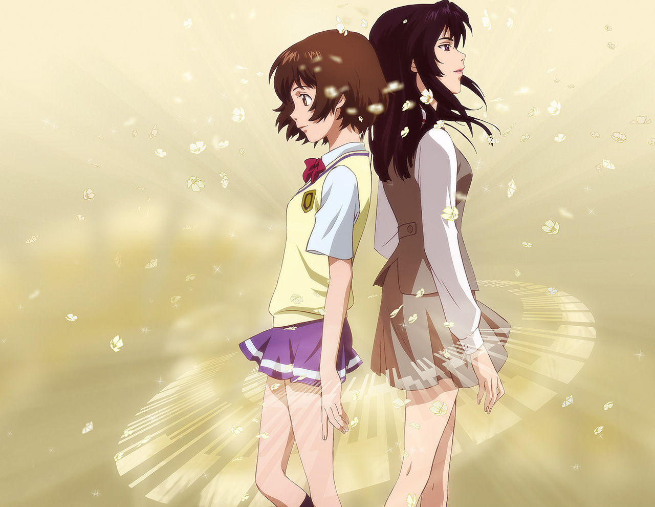 Description: Two anime girls standing next to each other in front of a yellow background with bubbles flying around them and a starburst in the sky.
