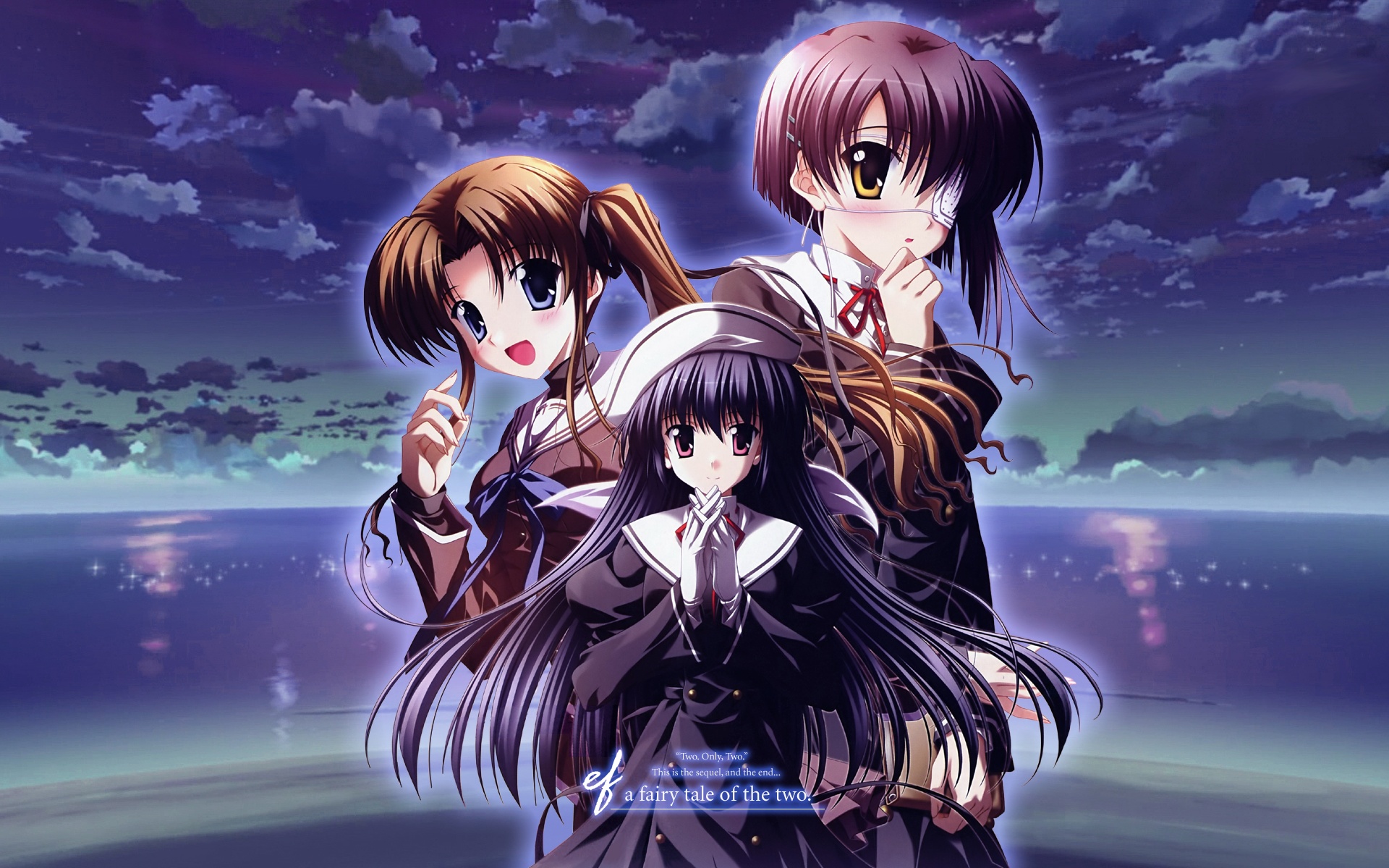 Description: A group of anime girls standing next to each other on a beach at night time with a cloudy sky.