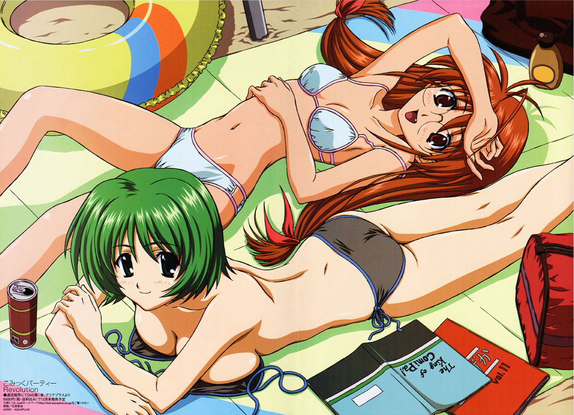 Description: A couple of anime girls laying on top of a bed next to each other on a beach towel and a book.
