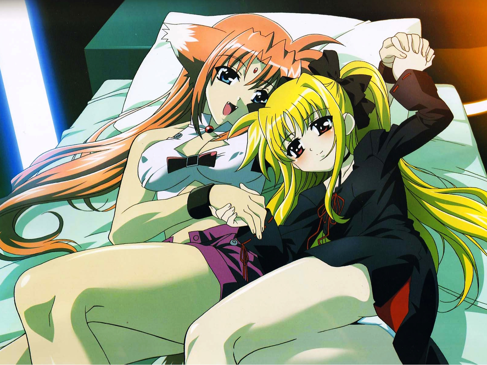 Description: Two anime girls laying on a bed with their arms around each other and one of them is holding a gun.