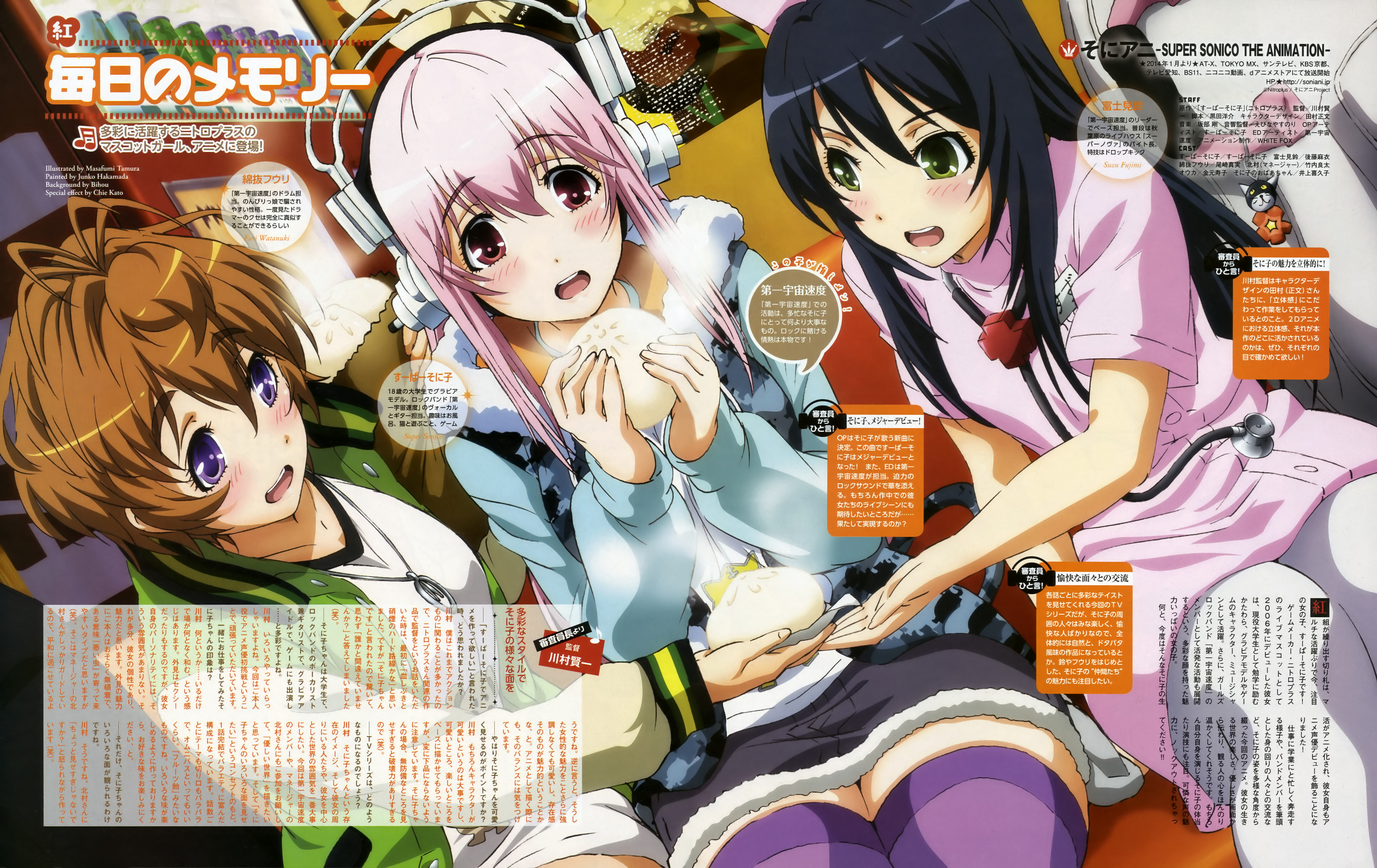 Description: A group of anime girls sitting next to each other on a bed with headphones on their ears and a magazine about the story behind them.