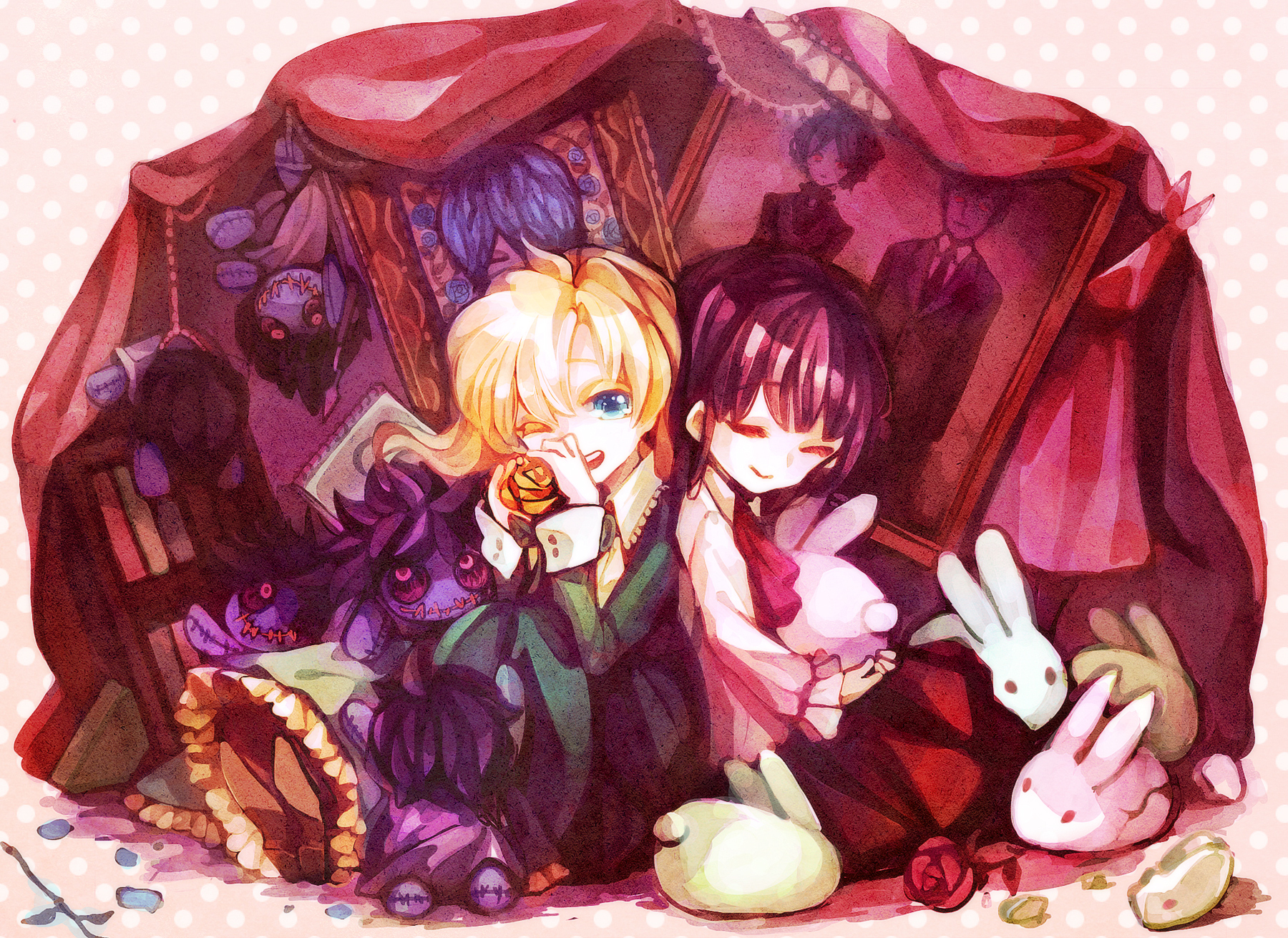 Description: A couple of anime girls sitting next to each other on a bed with a rabbit in front of them.