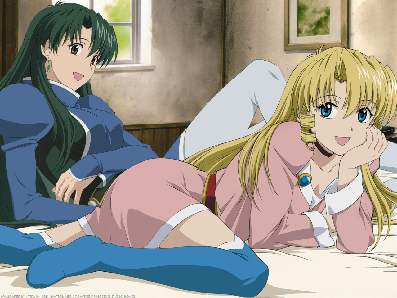Description: Two anime girls laying on a bed in a room with a window and a bed spread on the floor.