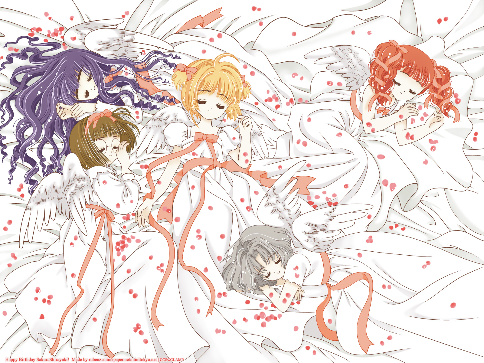 Description: A group of anime girls laying on top of a bed together with wings flying above them and hearts on the sheets.