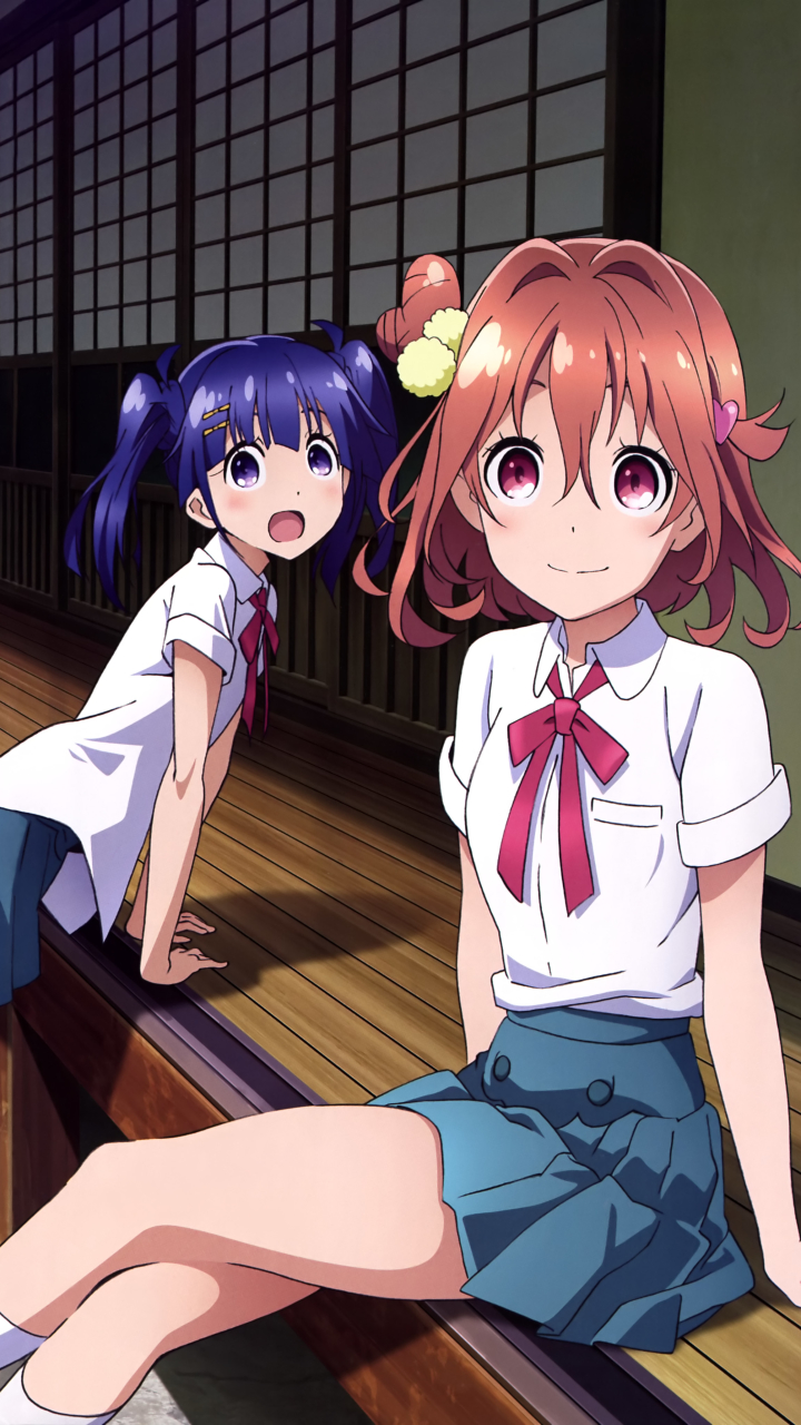Description: Two anime girls sitting on a bench in a room with a window and a door in the background.
