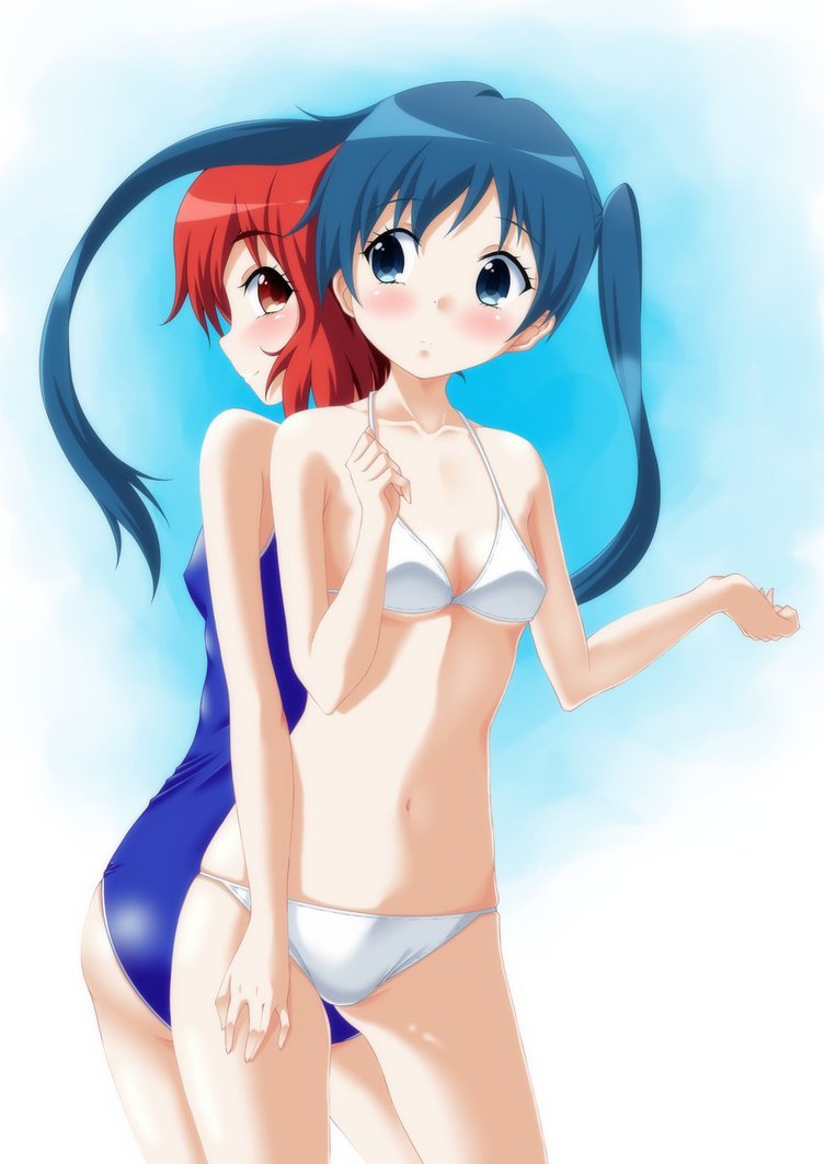 Description: Two anime girls in bikinis posing for a picture together.