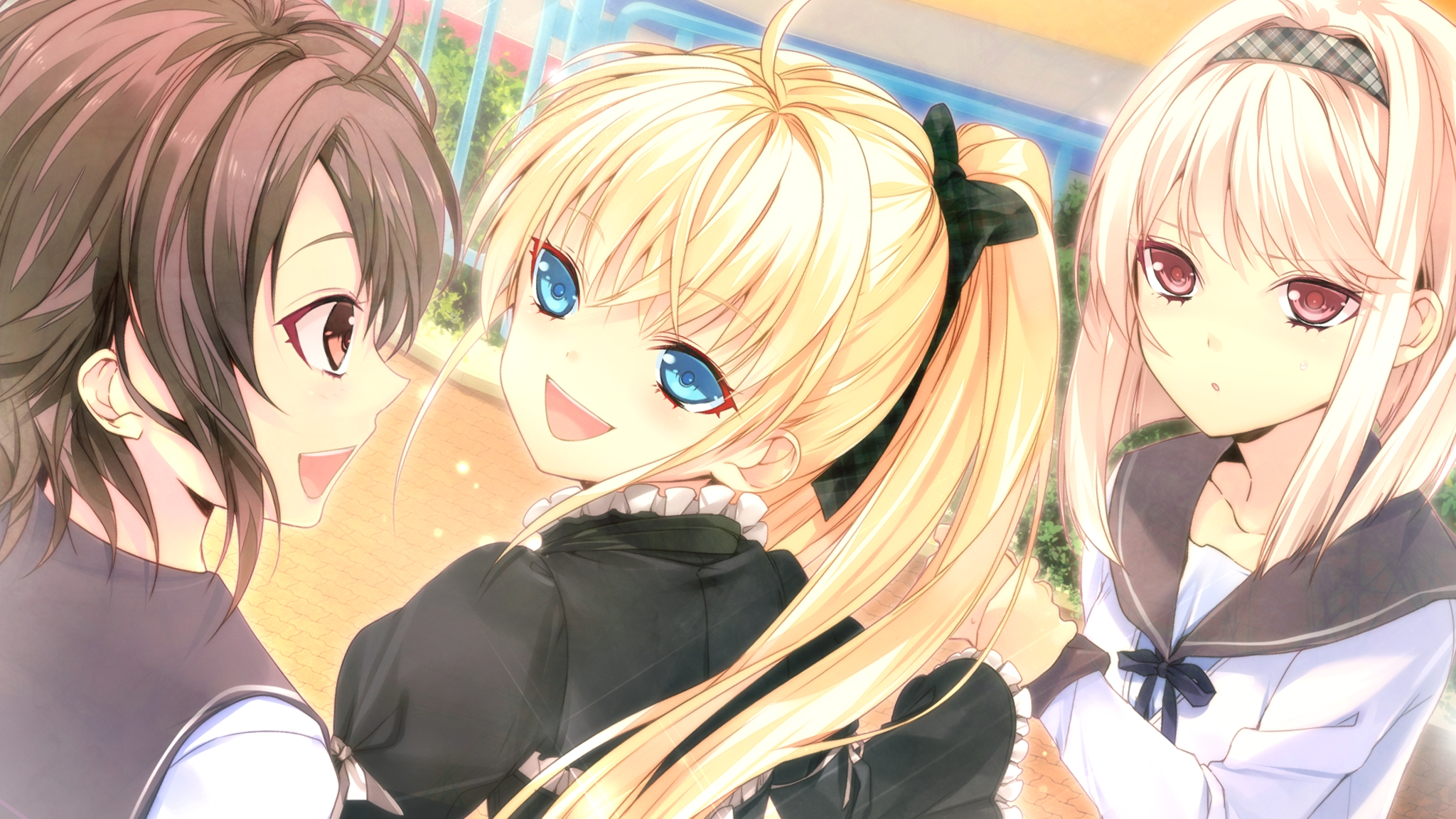 Description: Two anime girls with long blonde hair and blue eyes are looking at each other and smiling at the camera.