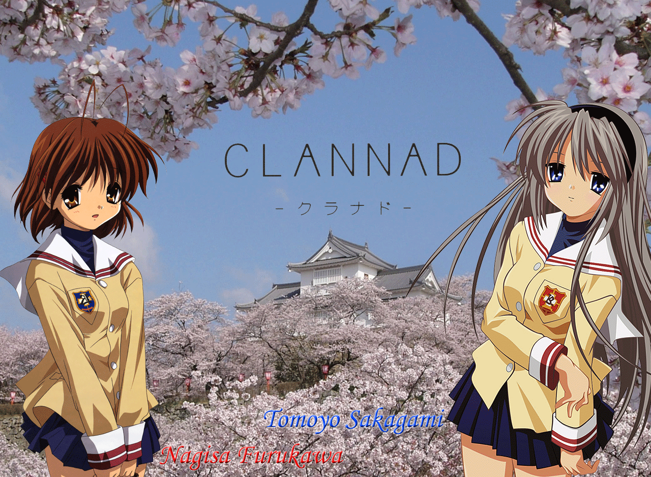 Description: Two anime girls standing in front of a tree with pink flowers in bloom and a castle in the background.