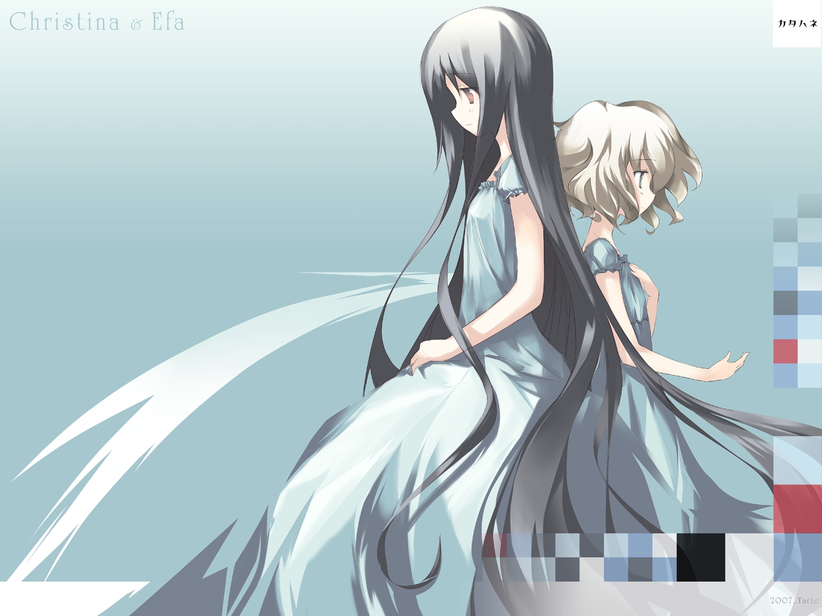 Description: A couple of anime girls standing next to each other in a blue dress with long hair and flowing white hair.