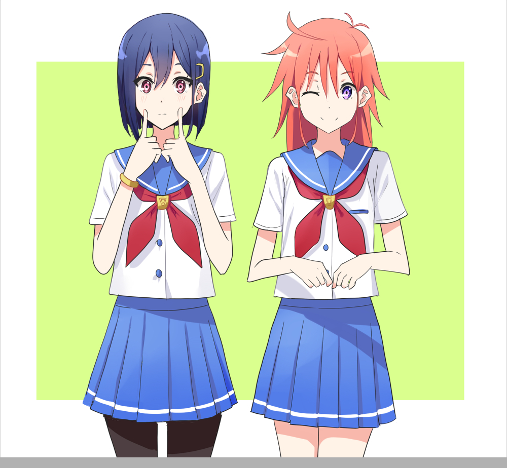 Description: Two anime girls with short hair and blue skirts are standing next to each other and one is wearing a red and white shirt.