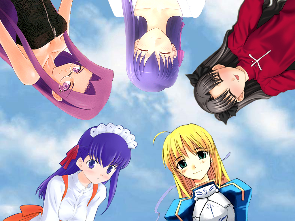 Description: A group of anime girls standing next to each other on a blue sky background with clouds in the background.