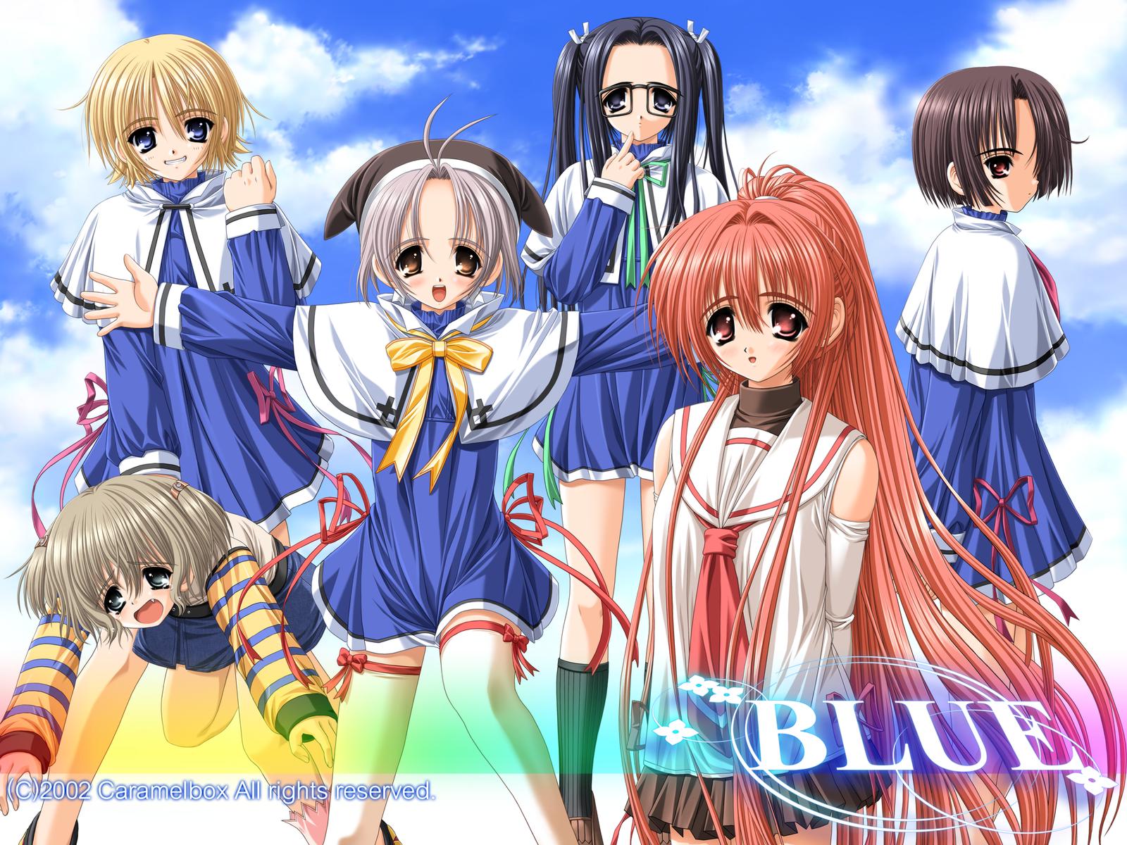 Description: A group of anime girls standing next to each other in front of a blue sky with clouds and rainbows.