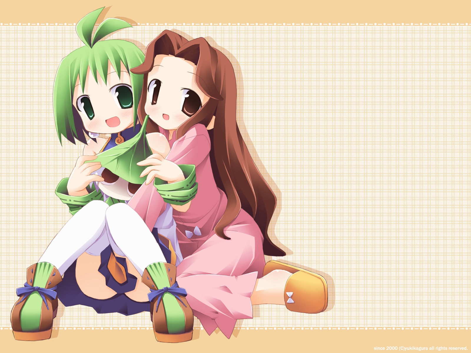 Description: Two anime girls sitting next to each other on a beige background with a white background behind them and a green background.