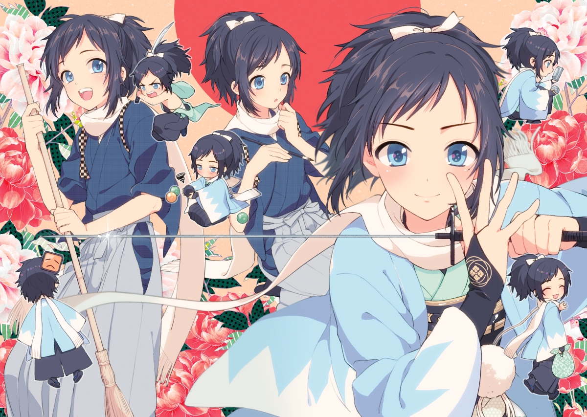 Description: A group of anime girls with a bow and arrows in their hands and a red background with flowers and a red sun.