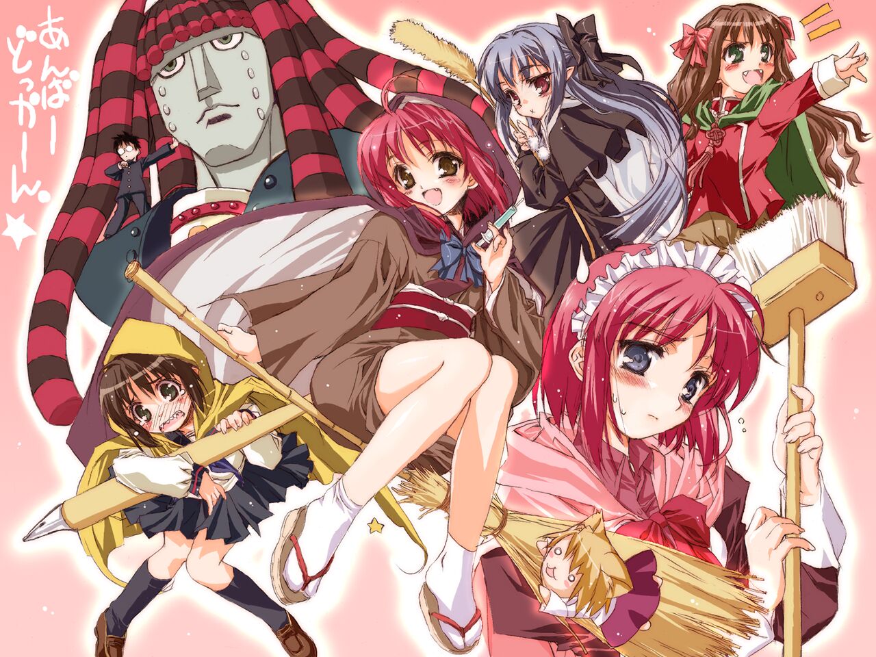 Description: A group of anime girls with brooms and a man in a costume behind them with a pink background.