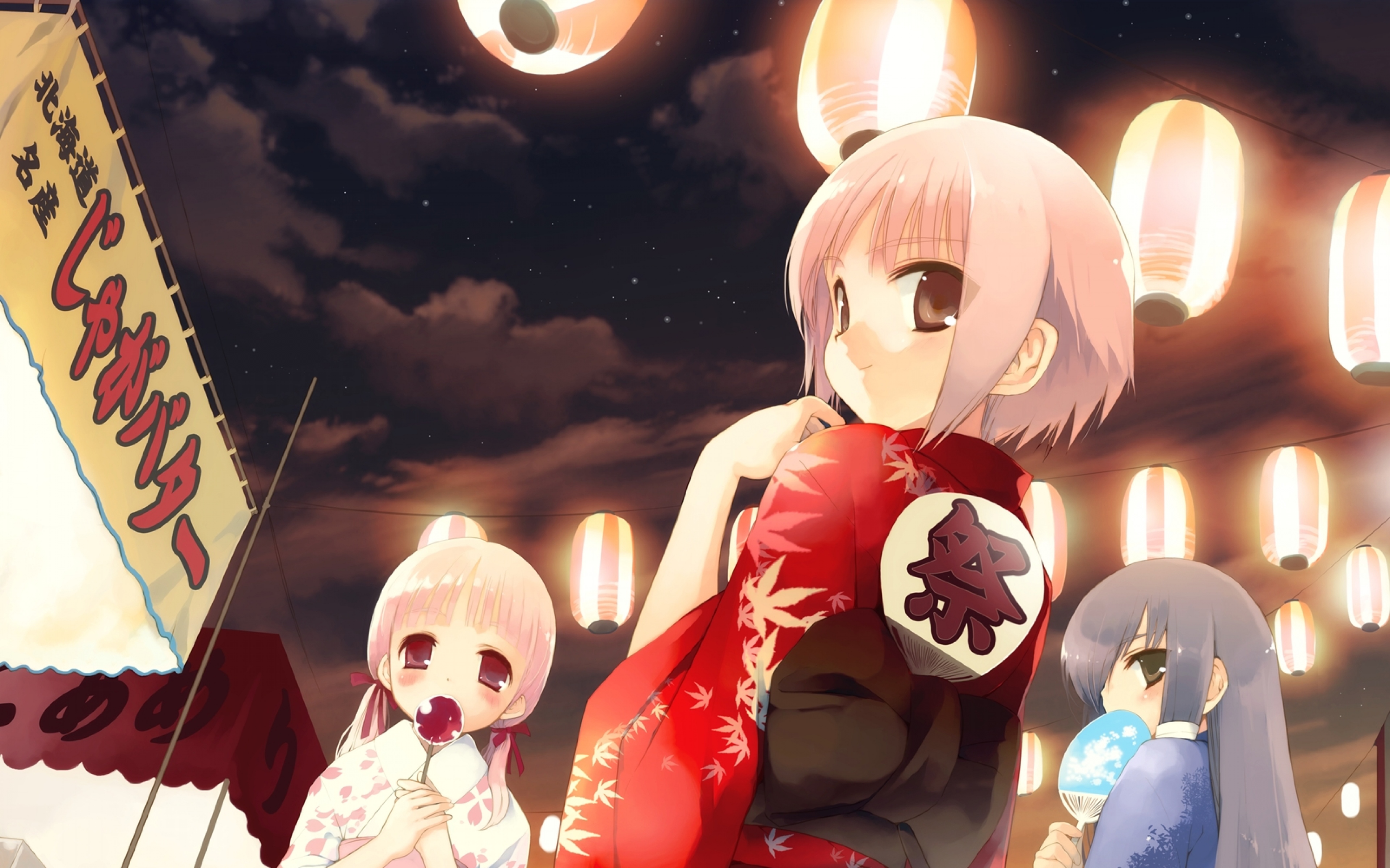Description: A group of anime girls standing next to each other in front of a building with lanterns hanging from the ceiling.