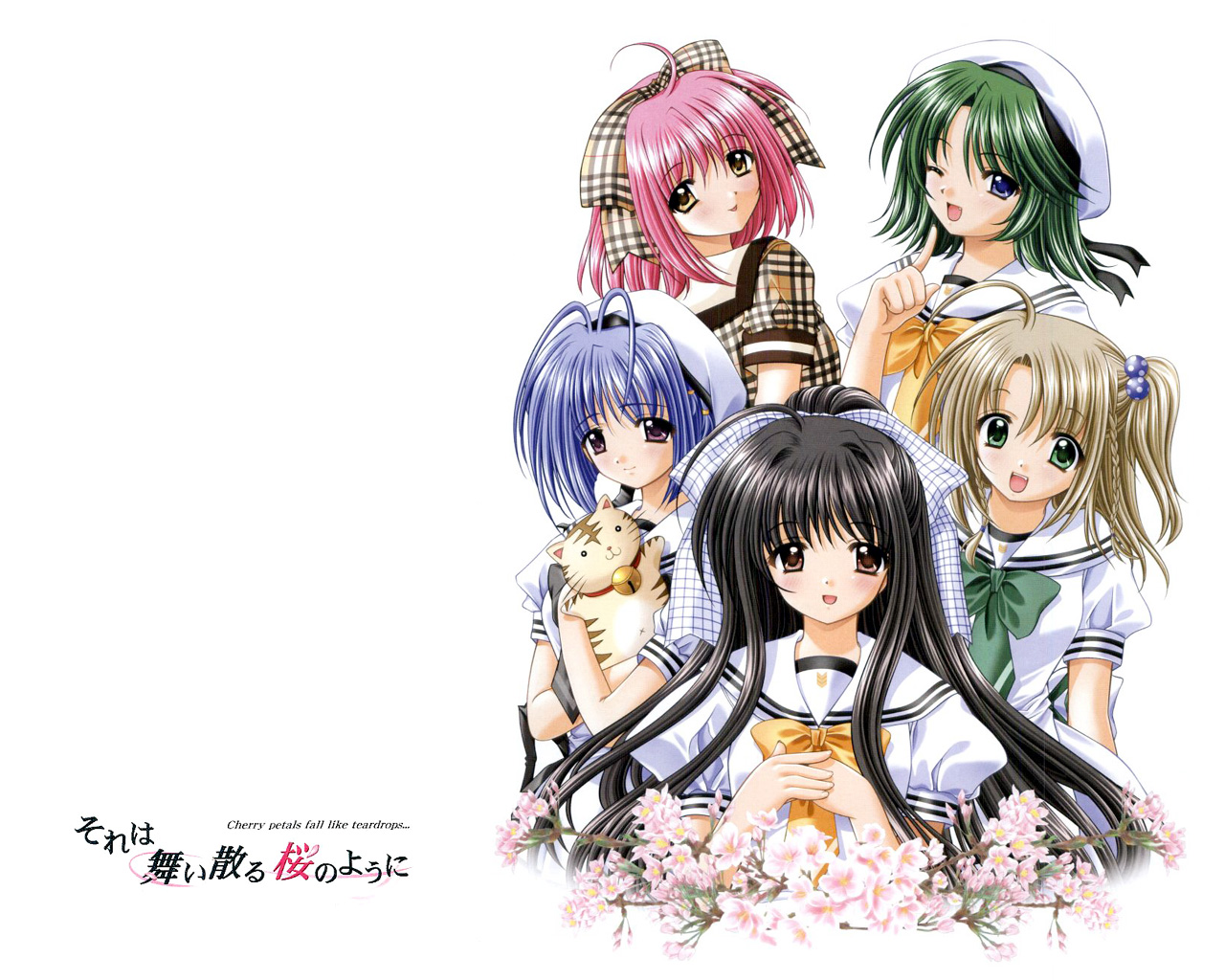 Description: A group of anime girls with long hair and a cat in their lap.