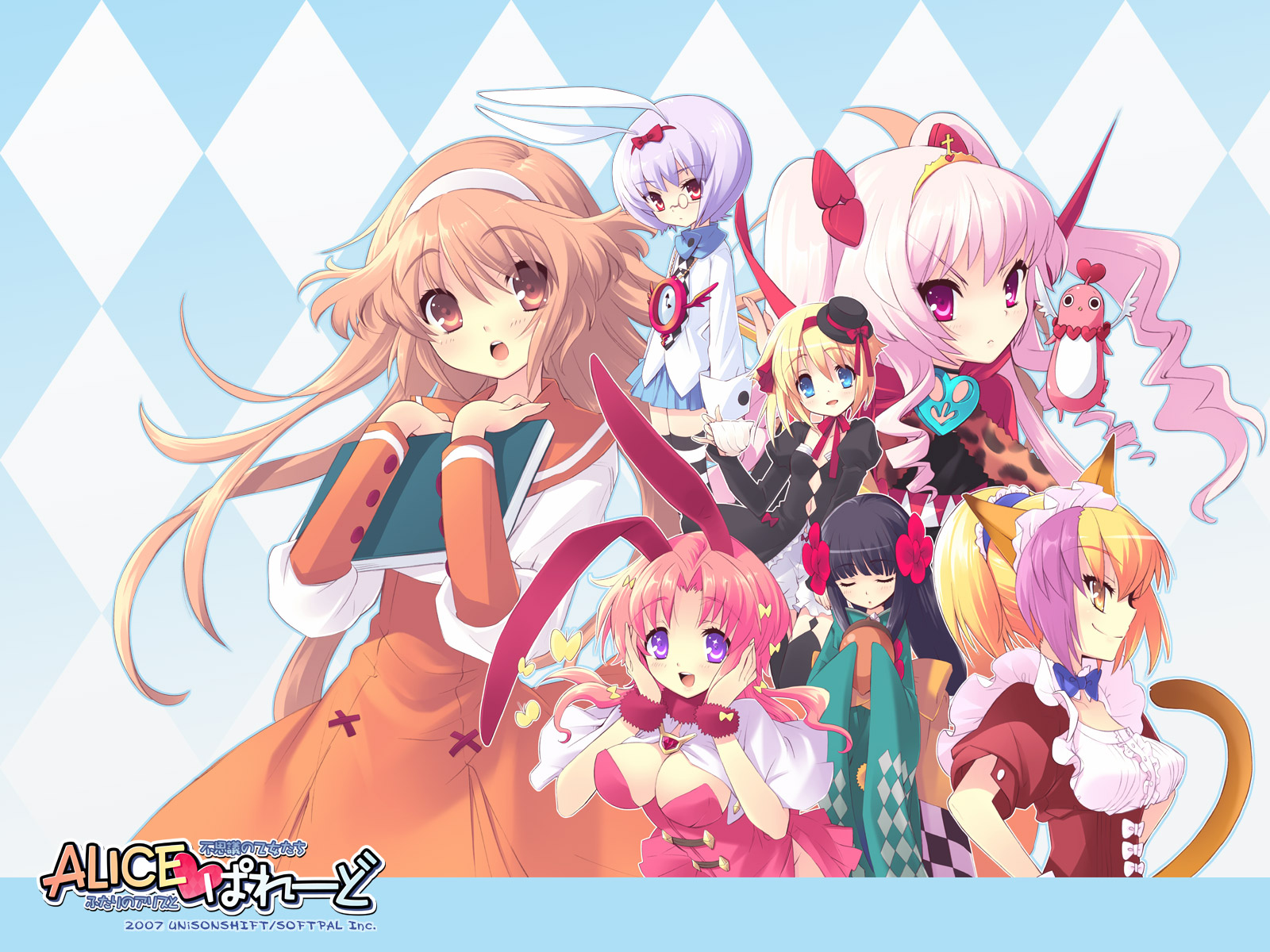 Description: A group of anime girls standing next to each other on a blue and white background with a checkered background.
