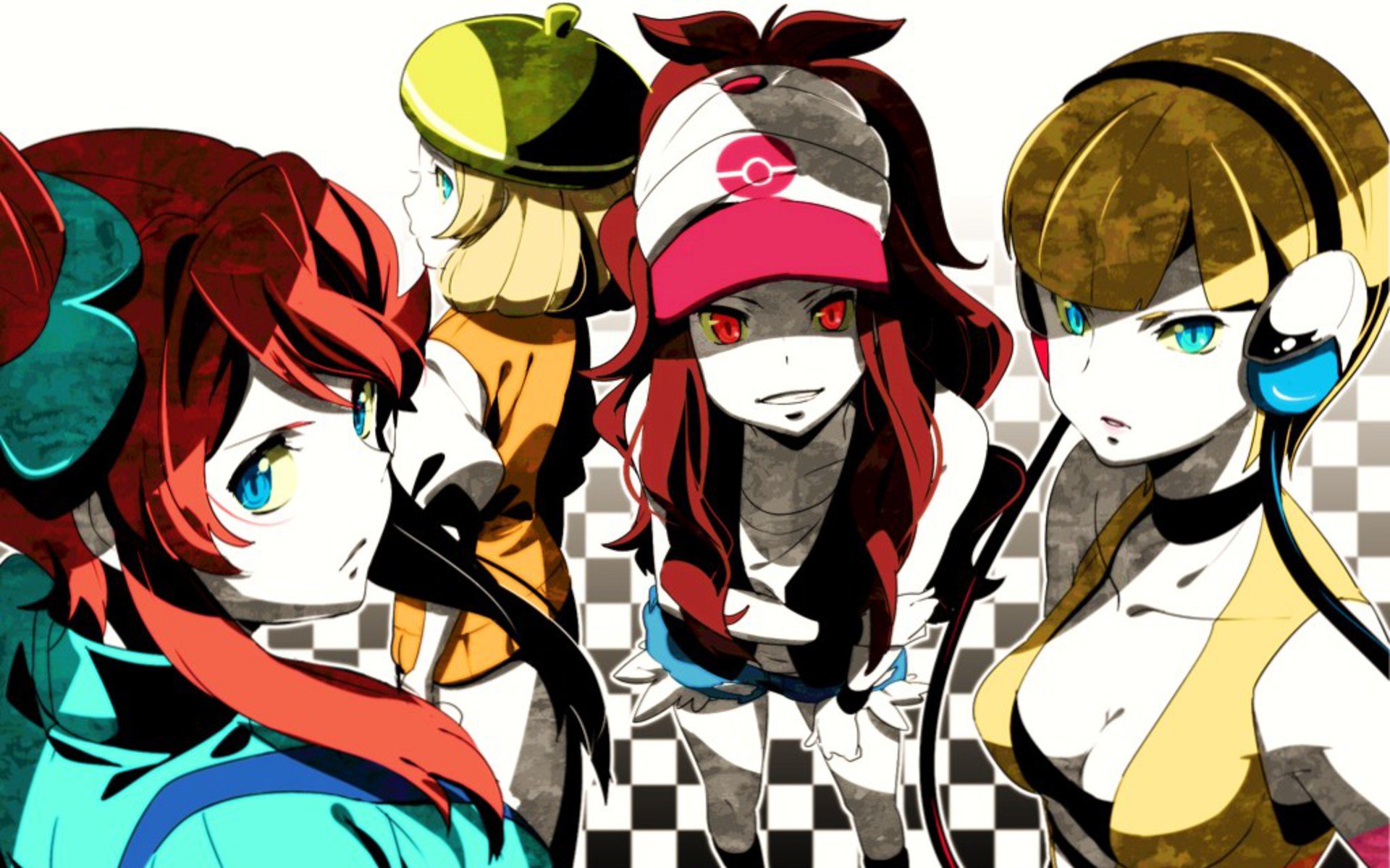 Description: A group of anime girls standing next to each other on a checkered background with a white background and a black and white checkerboard background.