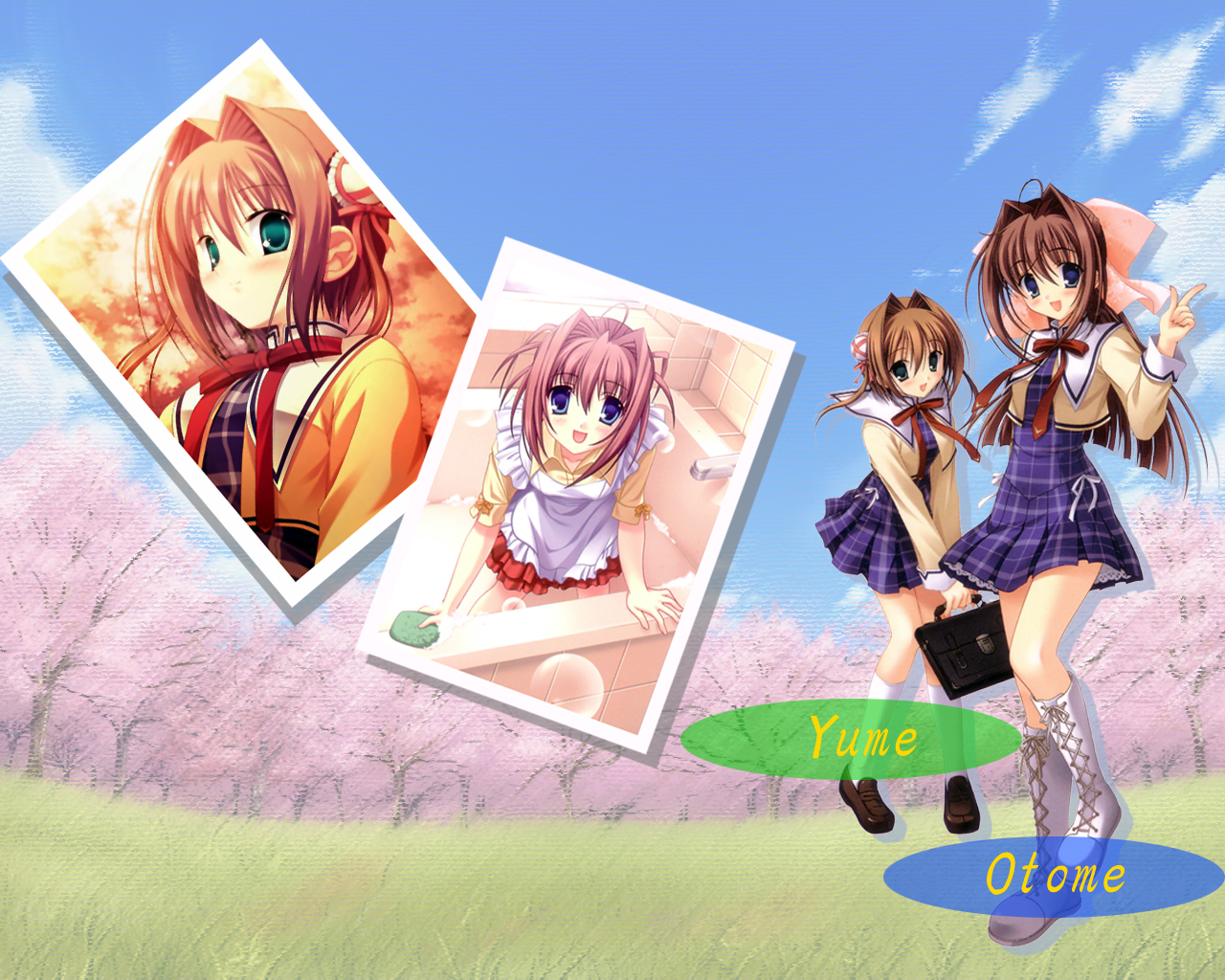 Description: A couple of anime girls standing next to each other on a field of grass and trees with pink flowers.