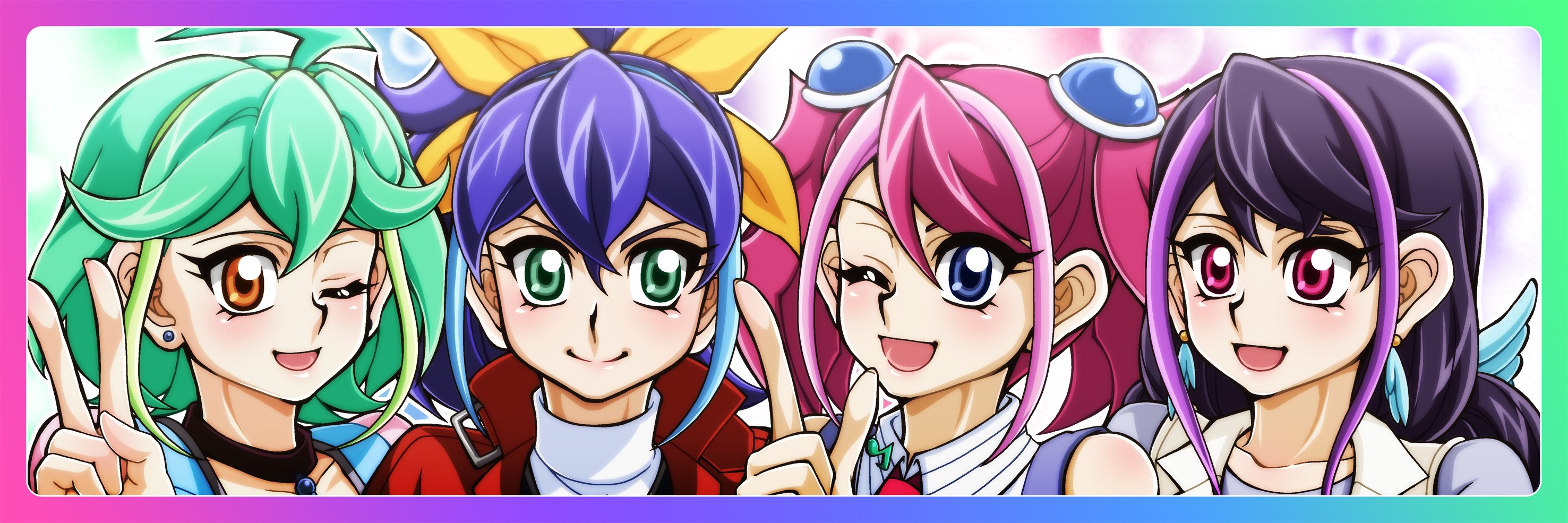 Description: A group of anime girls with different colored hair and glasses on their faces.