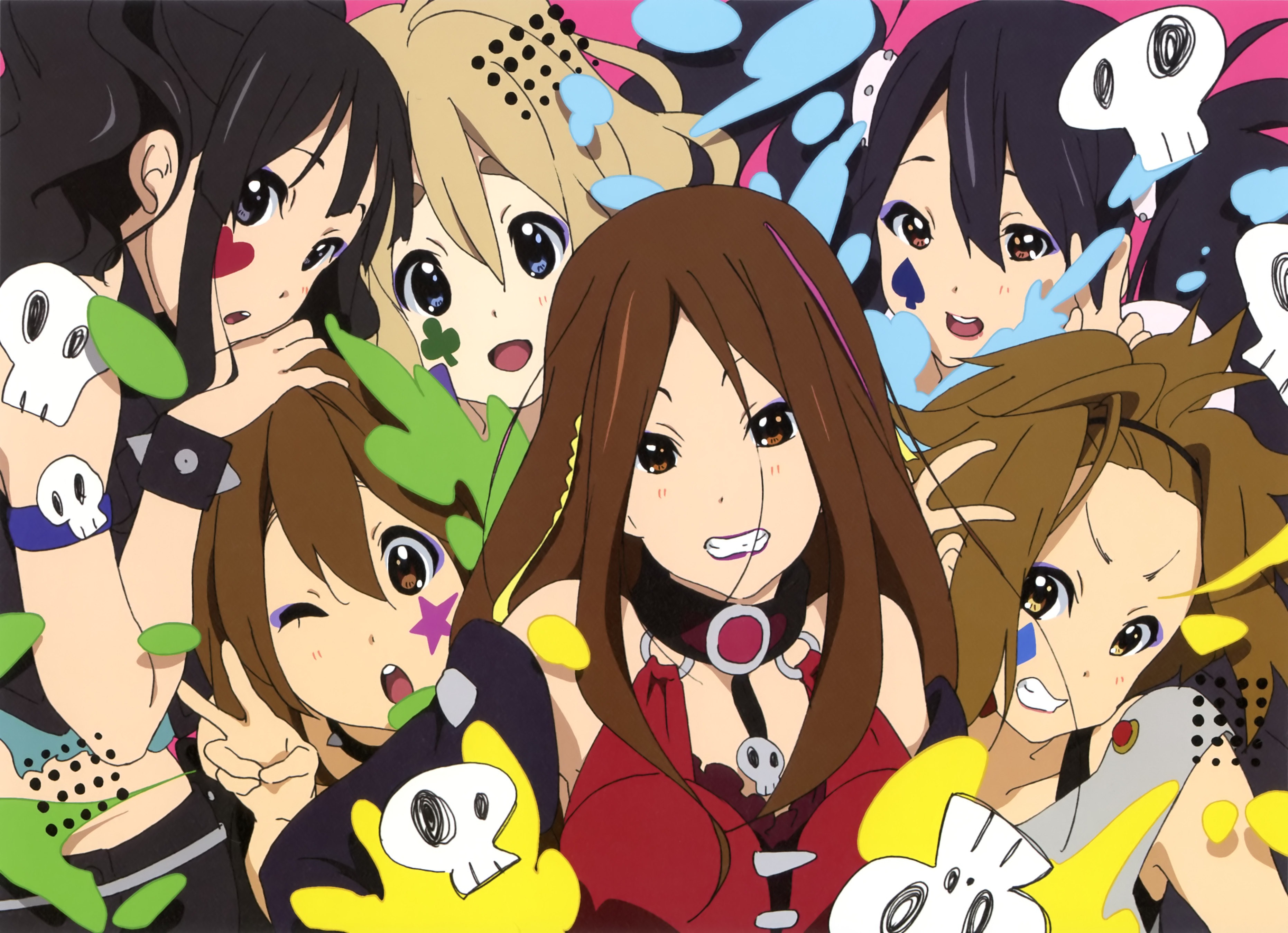 Description: A group of anime girls with different colored hair and makeup looks at the camera with a smile on their face.