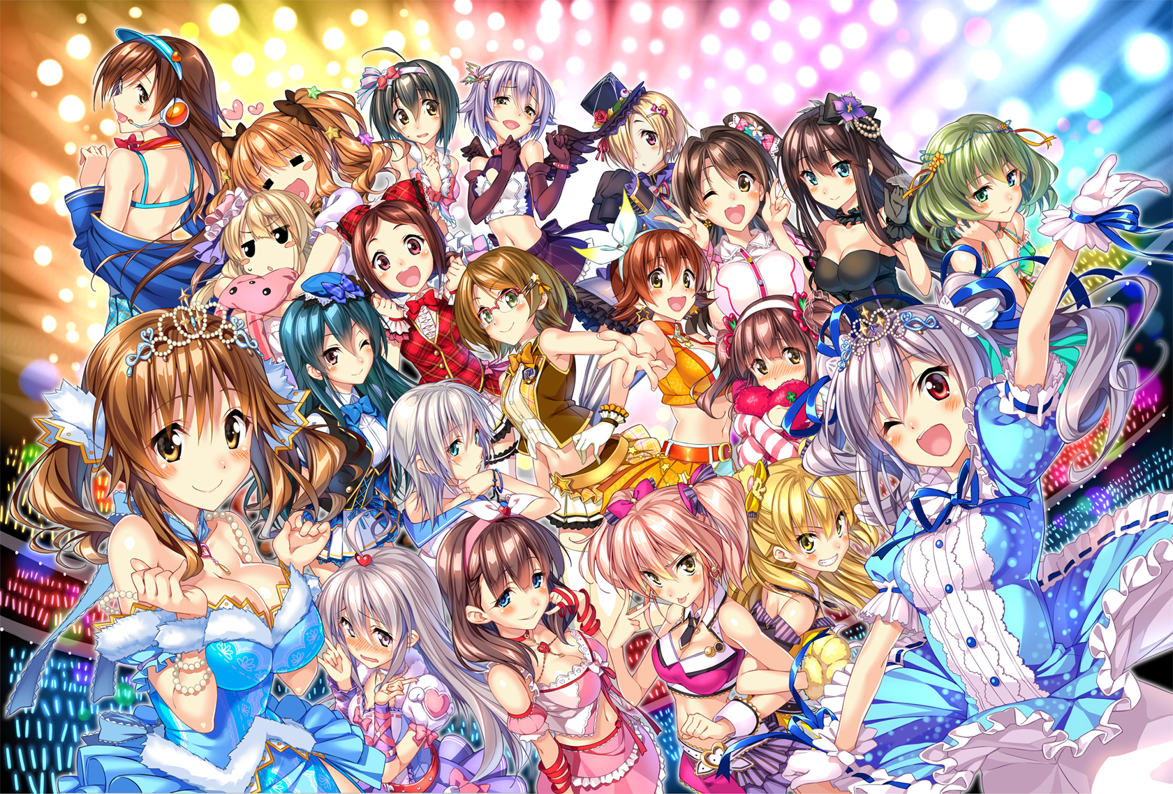 Description: A group of anime girls in a colorful background with a rainbow light behind them and a black background with a white cat.