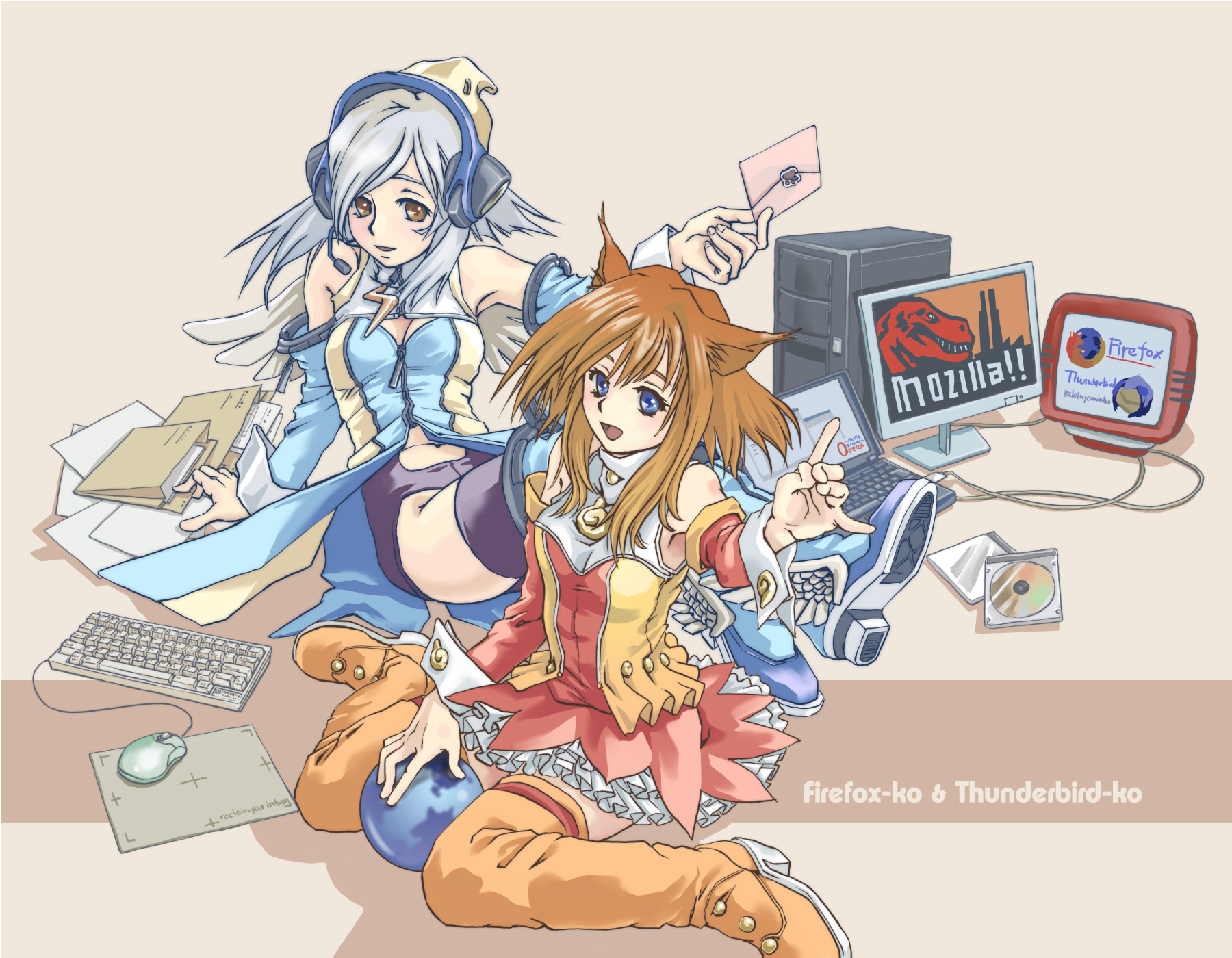 Description: A couple of anime girls sitting next to each other on a floor with a computer and a mouse on it.