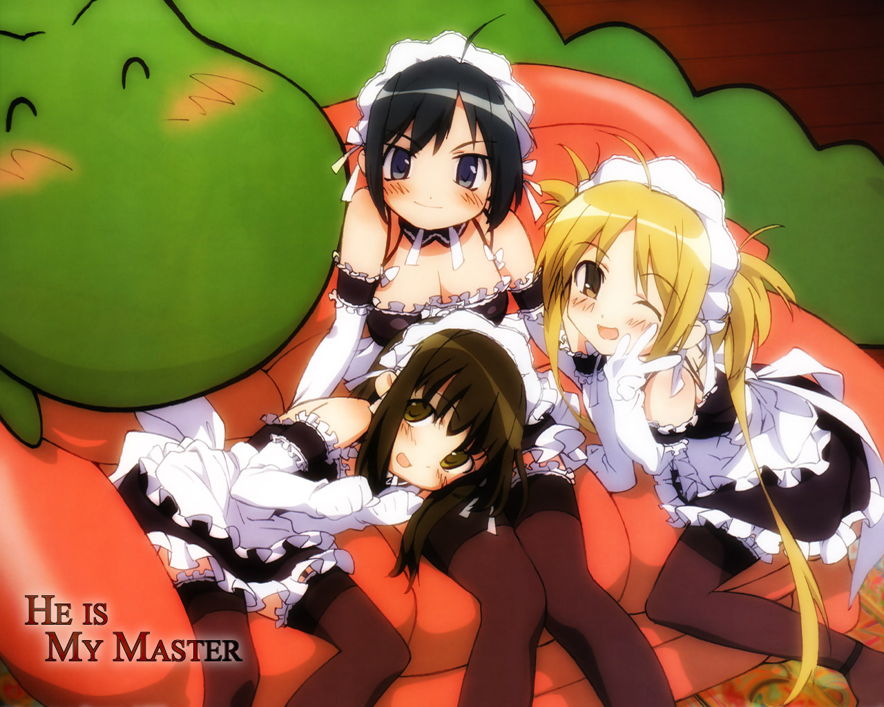 Description: A group of anime girls sitting on a couch together with a large green monster behind them and a caption that reads he is my master.