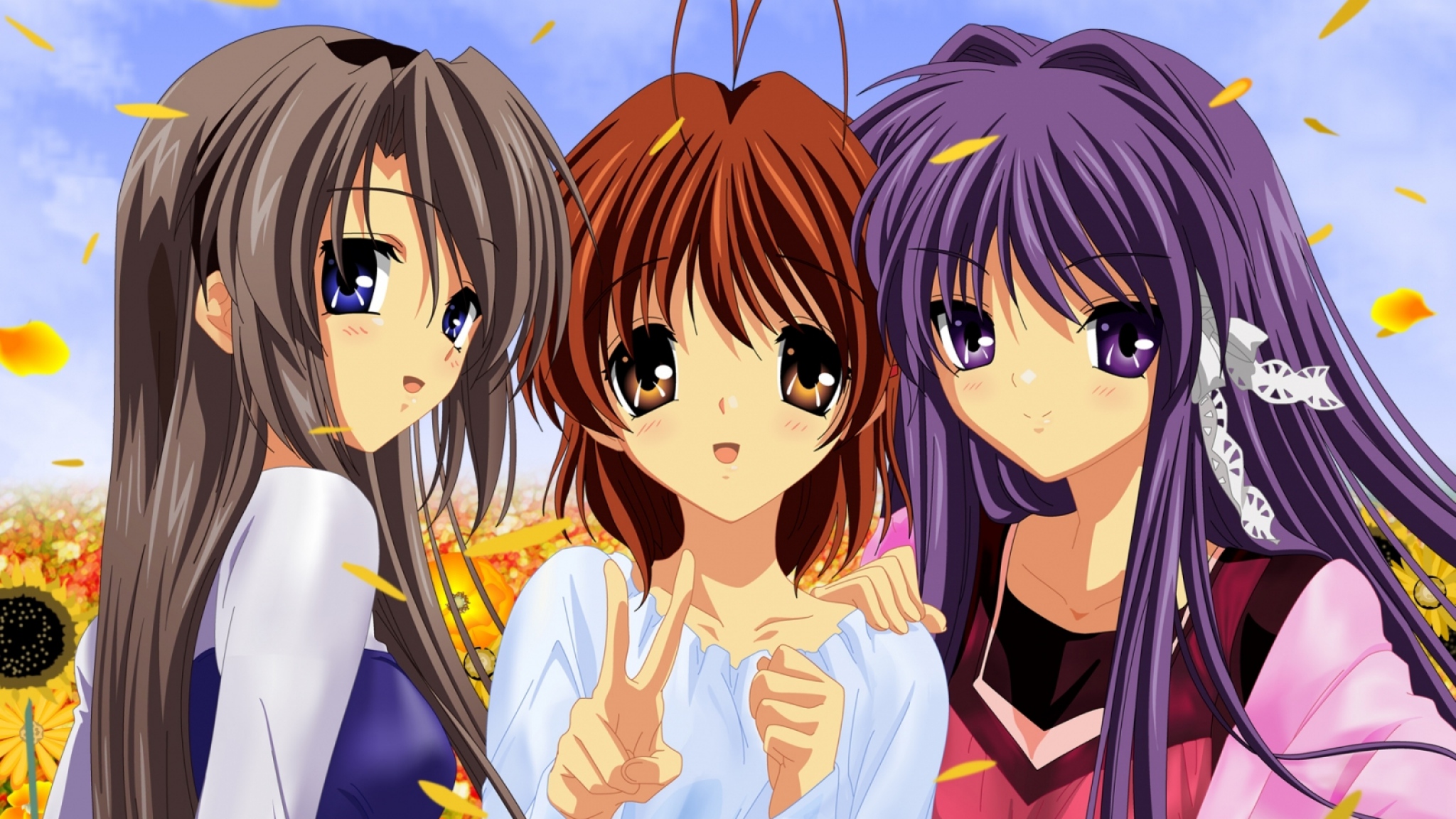 Description: Three anime girls standing in a field of flowers giving the thumbs up sign with their hands and looking at the camera.
