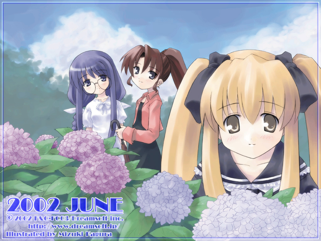 Description: A group of anime girls standing next to each other in front of flowers and trees with the words 200 june.