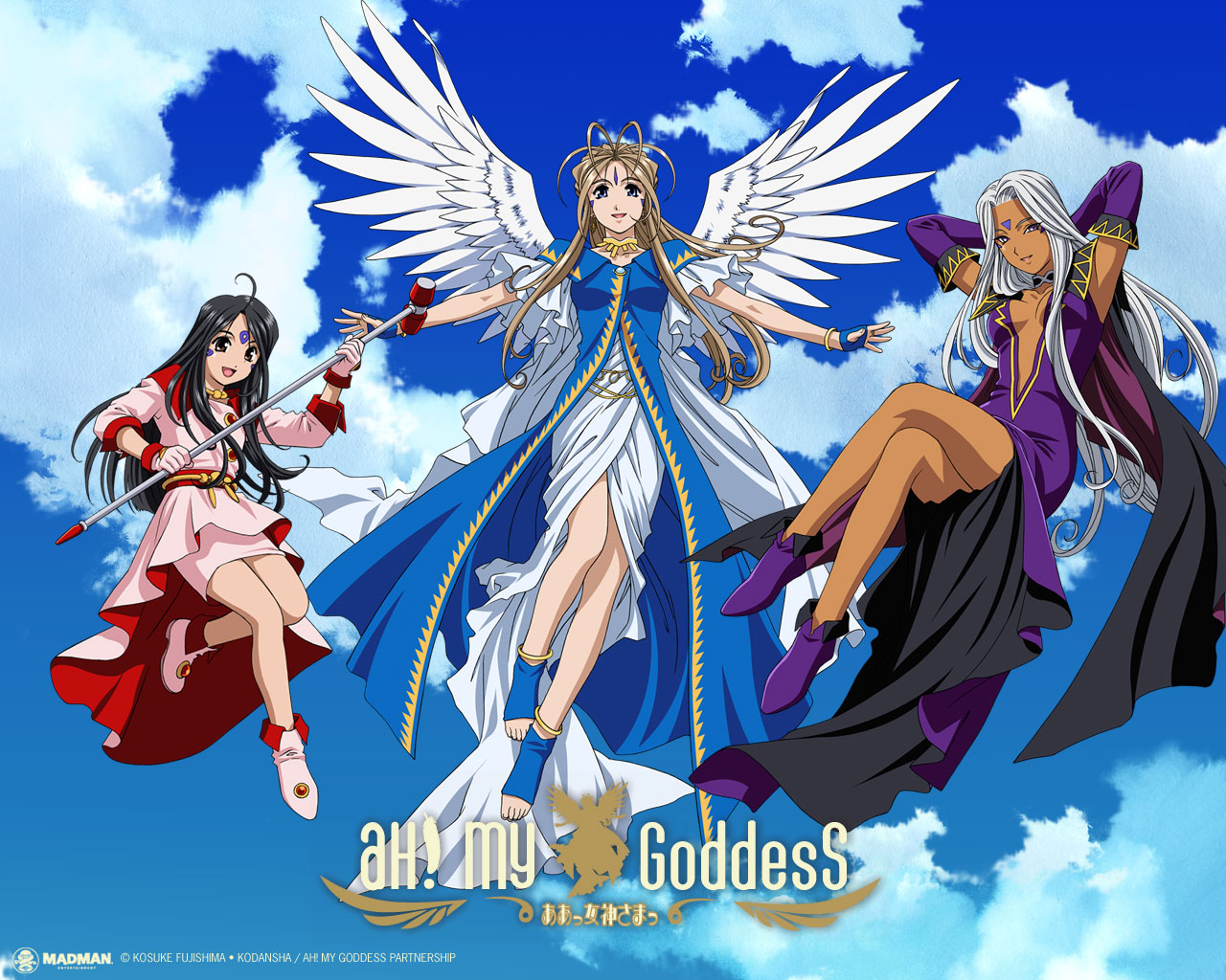 Description: Three anime girls flying in the sky with wings on their backs and the words.
